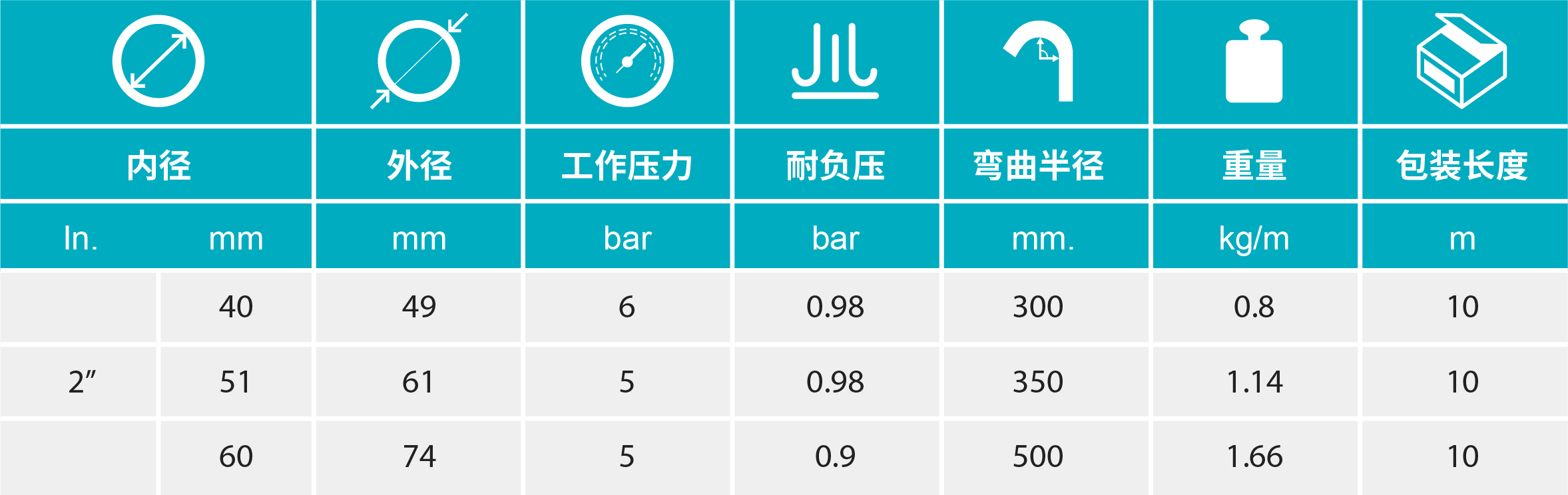 设计用于磨损性物料的抽吸或排放,耐水解,内衬卫生级TPU涂层,可用于输送食品或酒精浓度低于20%的酒类