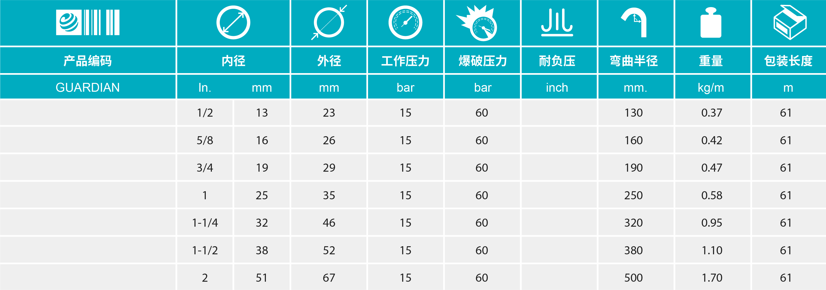 内胶层:黑色导电EPDM合成橡胶 增强层:多层高强度合成纤维螺旋 外胶层:黑色、导电EPDM合成橡胶;具有耐高温、耐磨、耐候和耐臭氧性能 工作温度:-40°C到+165°C 爆破压力:最小值60bar 安全系数:热水3:1,蒸汽10:1 标准长度:61m