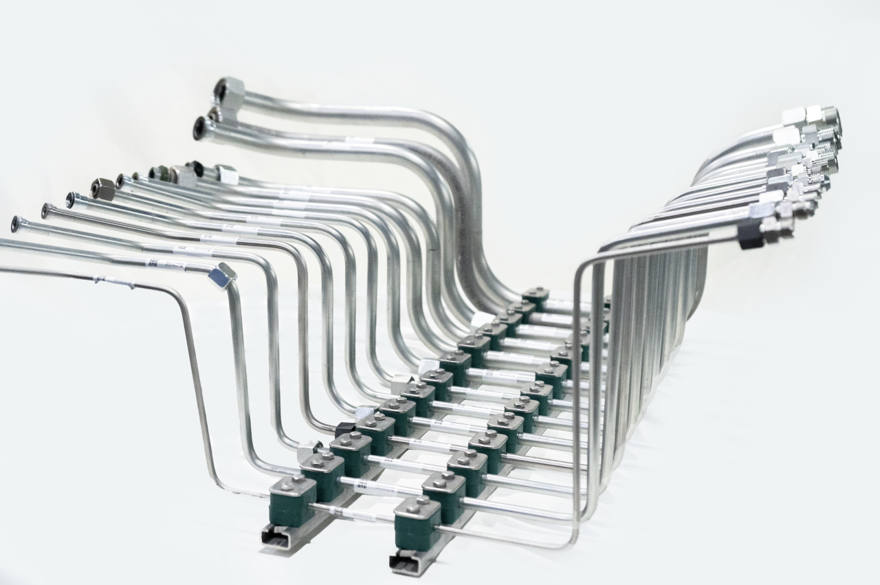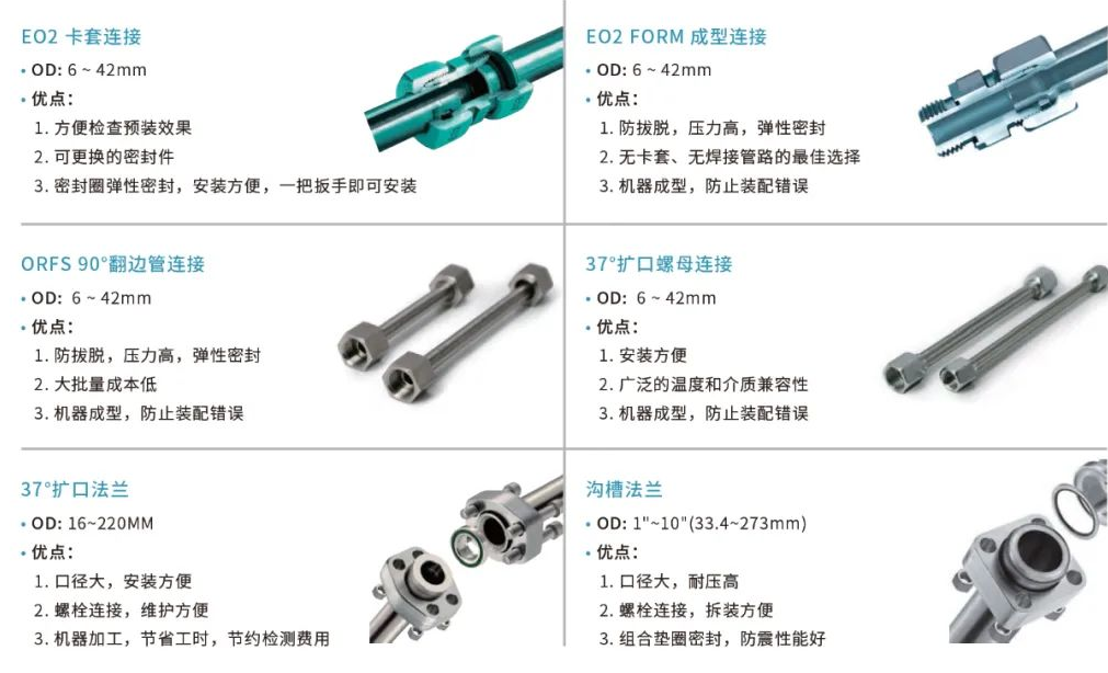 管路的连接形式有多种可选,例如EO形式单卡套,EO2卡套,EO2FORM成型,37°扩口,90°ORFS翻边成型,管路连接均采用无焊接的连接方式,保证管路的清洁度和可靠性。