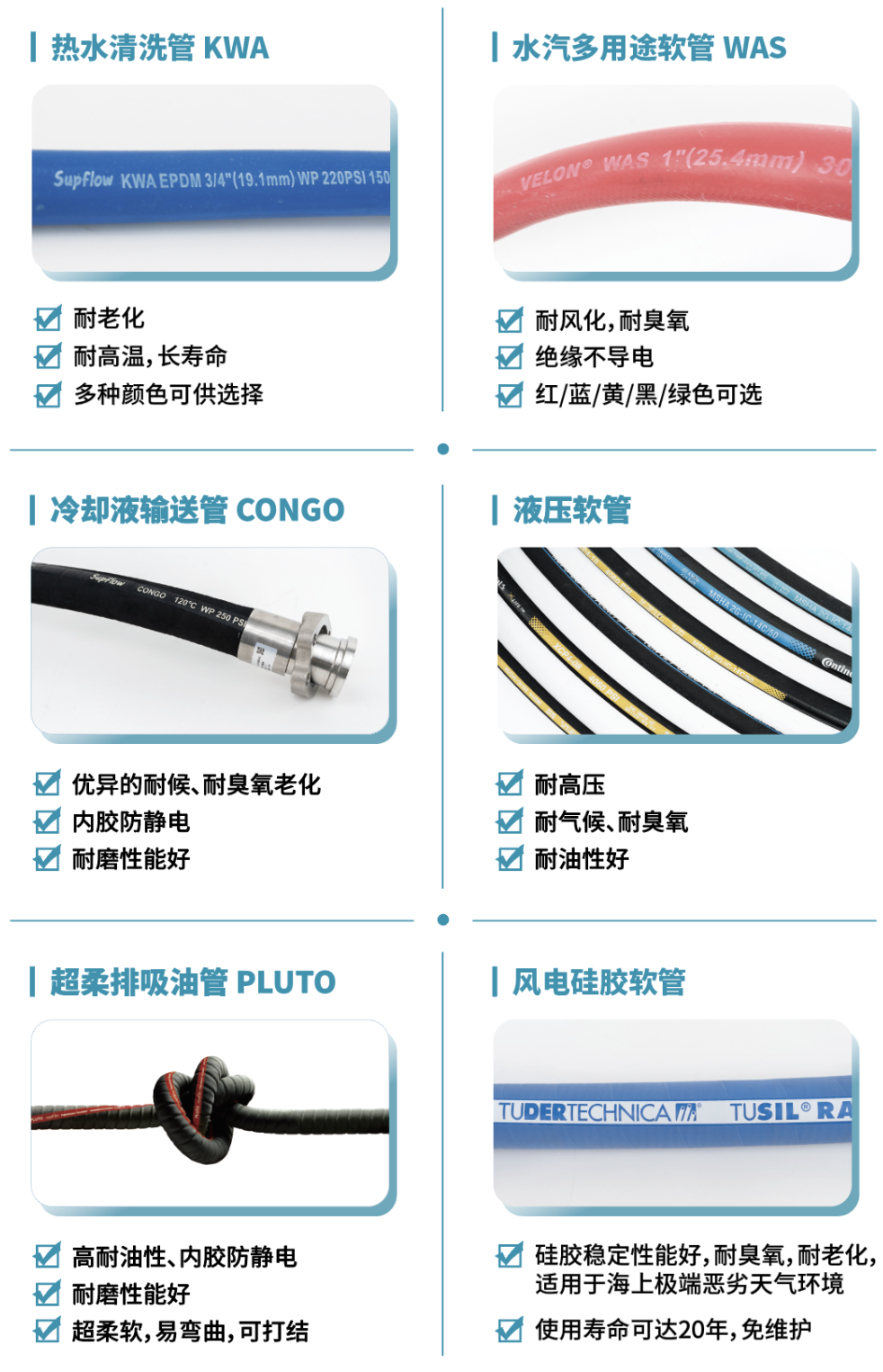 可提供满足各大船级社认证要求的液压软管总成,软管经过严格的压力测试和热油冲洗出厂;还有适用于风电发电机冷却系统中的防冻液输送以及风机中的乙二醇冷却等应用场景的排吸软管;还可以提供易弯曲,可打结,内胶可防静电的超柔油管等。