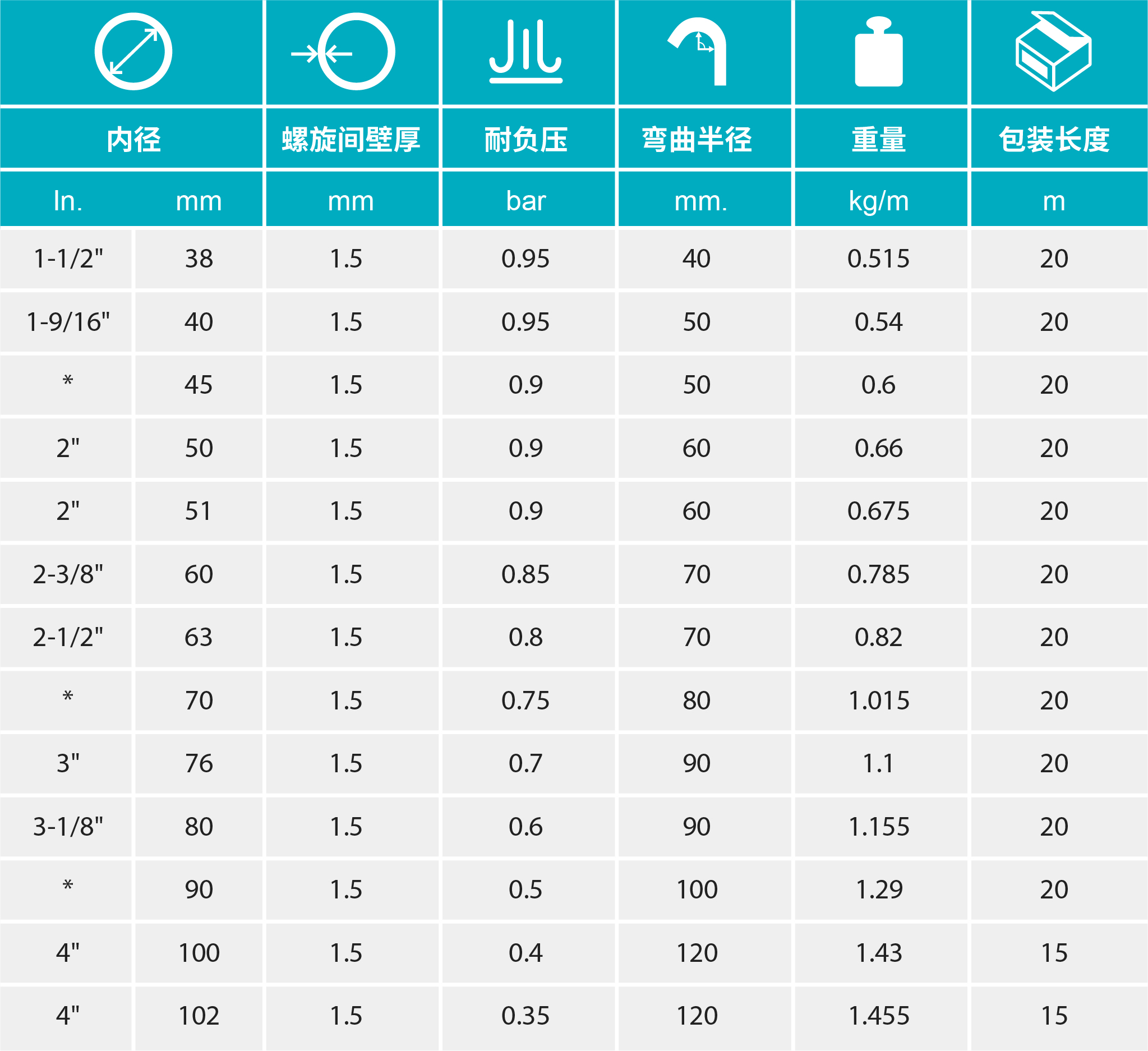 - 不同尺寸的软管其螺旋间壁厚均为1.5mm