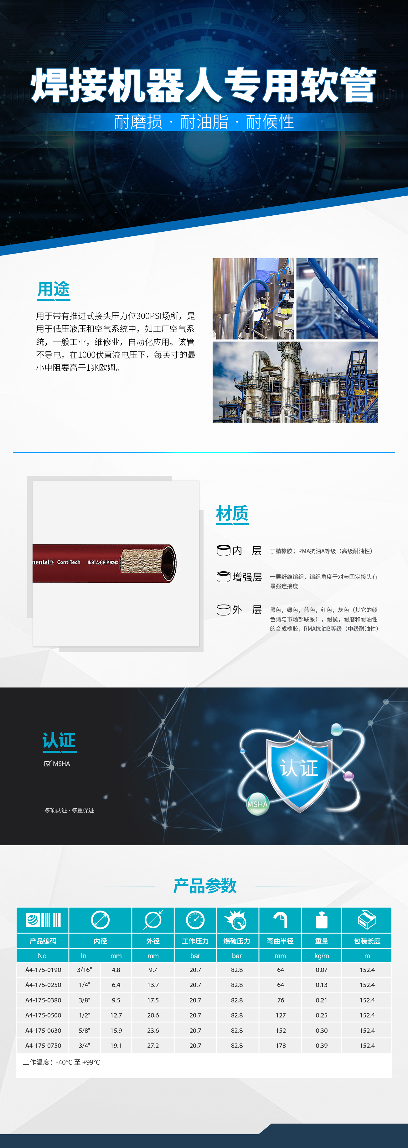 用于带有推进式接头压力位300psi场所,是用于低压液压和空气系统中,如工厂空气系统,一般工业,维修业,自动化应用。该管不导电,在1000伏直流电压下,每英寸的min电阻要高于1兆欧姆。