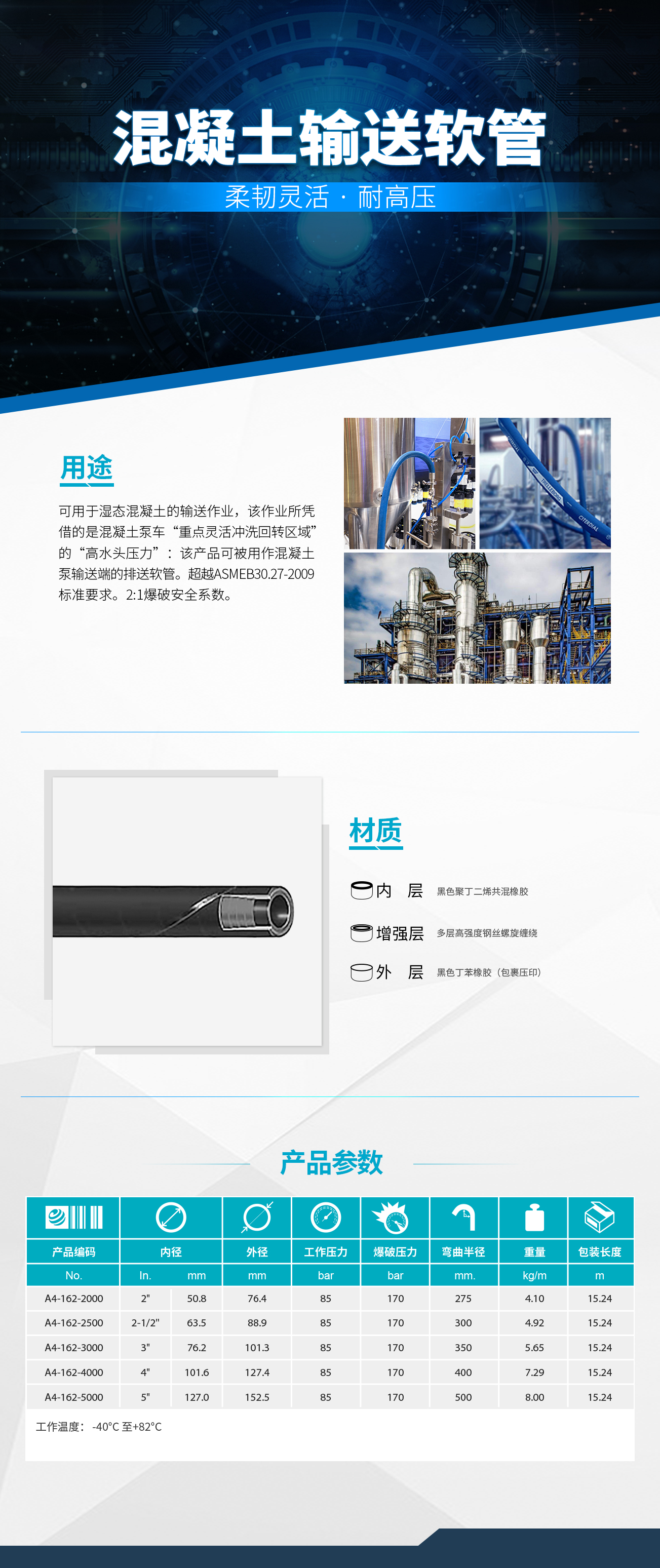 本品可用于湿态混凝土的输送作业,该作业所凭借的是混凝土泵车“重点灵活回转区域”的“高水头压力”;该产品可被用作混凝土泵输送端的排送软管。
