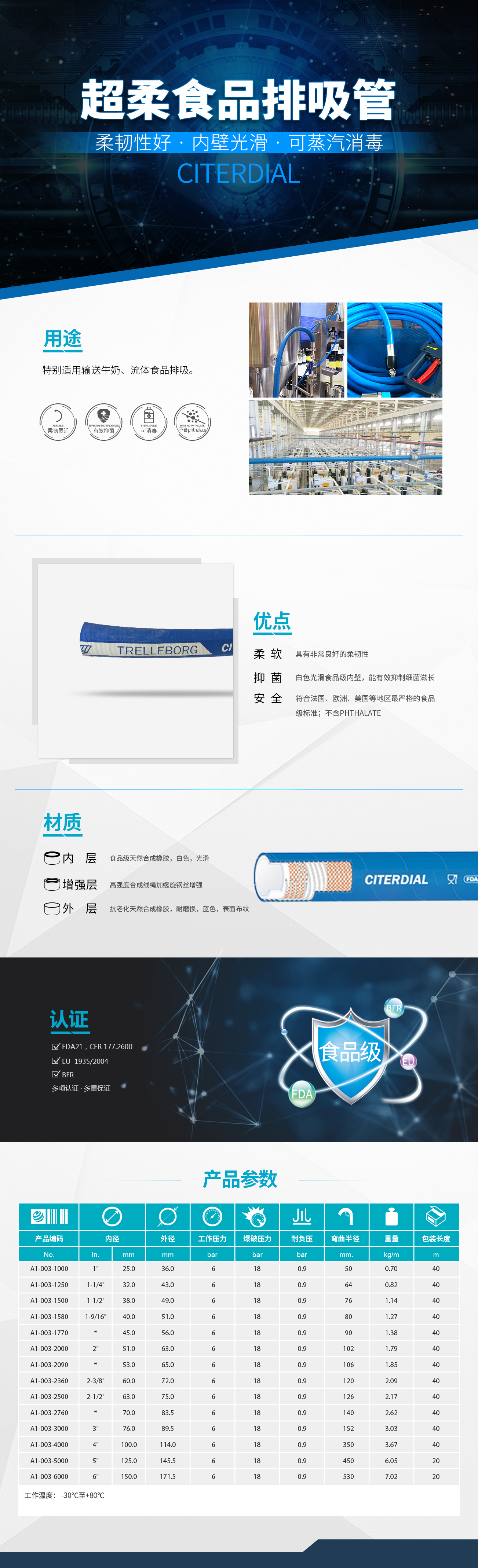 - 特别适用于输送牛奶,主要用于奶源收集站、奶罐车、奶品加工及灌装设备等工作场合也可用于其他流体食品的排吸,如红酒、啤酒、果酒、果汁、食醋、96%浓度酒精等。