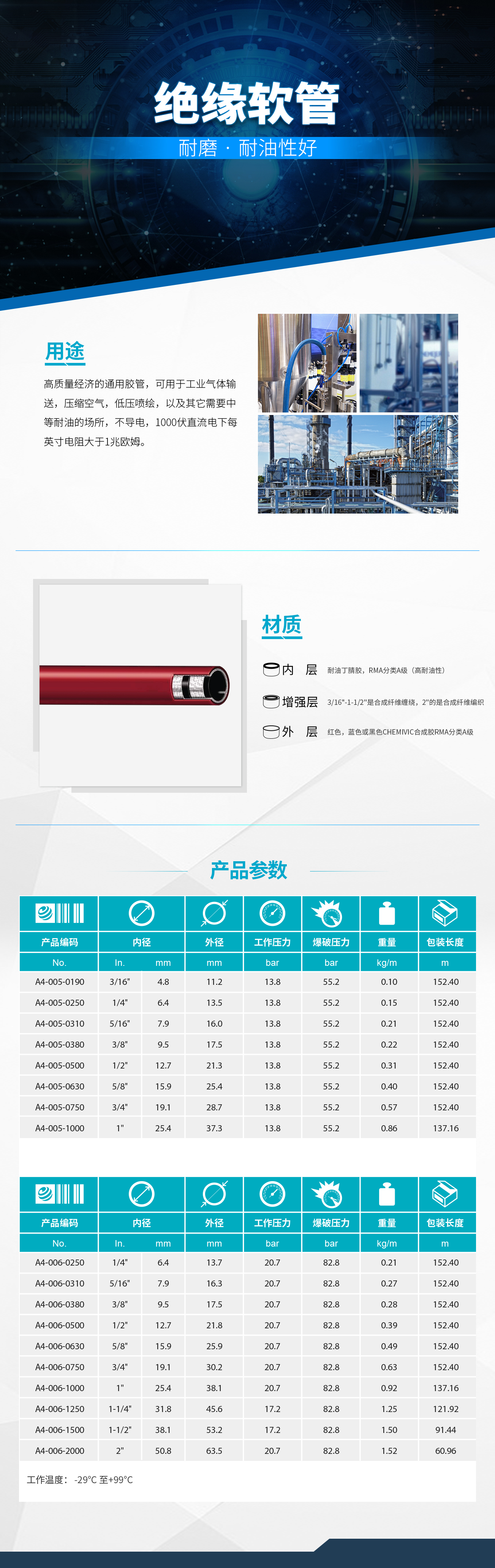 高质量经济的通用胶管,可用于工业气体输送,压缩空气,低压喷绘,以及其它需要中等耐油的场所,不导电,1000伏直流电下每英寸电阻大于1兆欧姆。