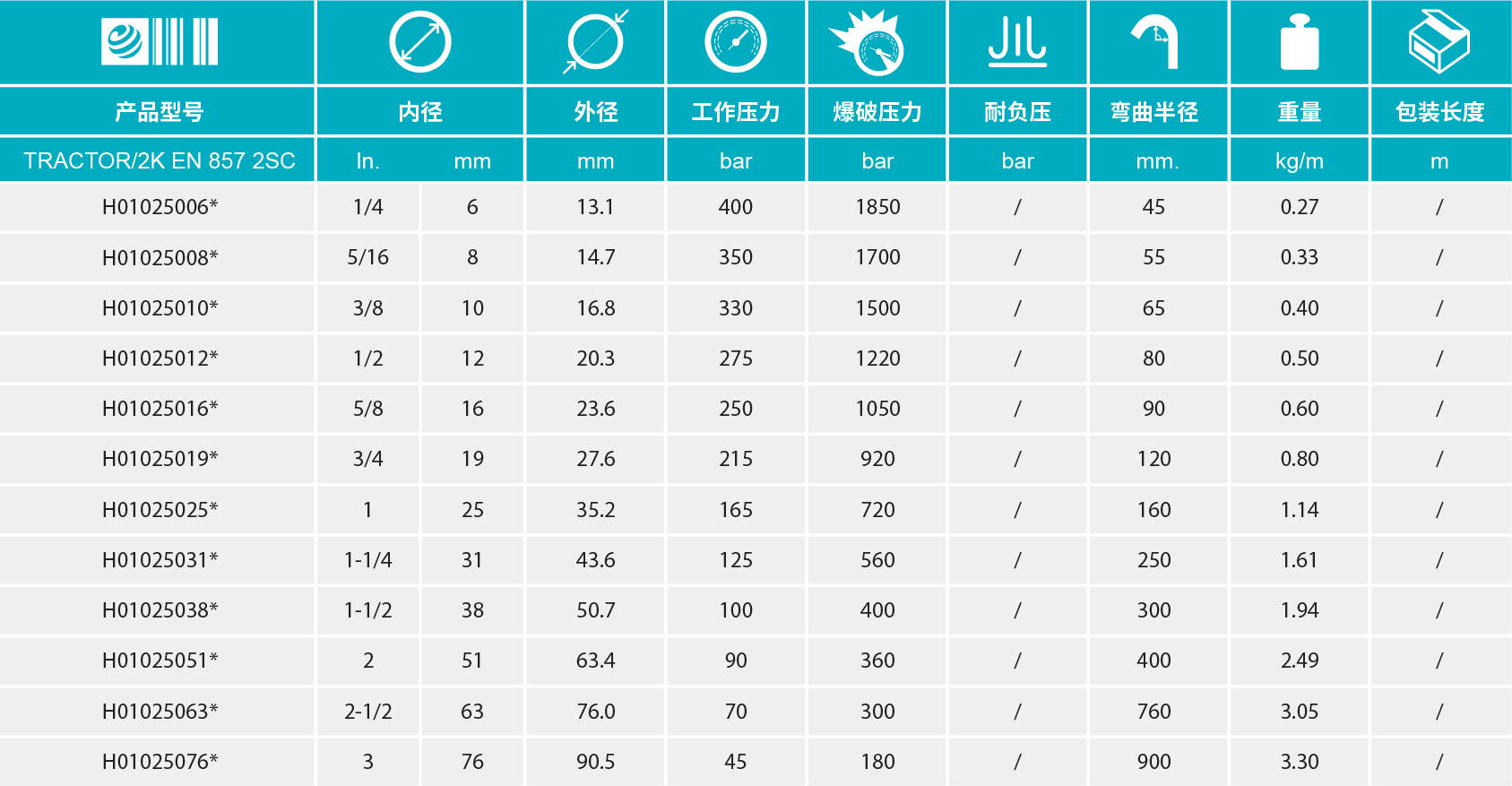 【应用标准】EN 857 2SC, ISO 11237-1 2SC, SAE100 R16S