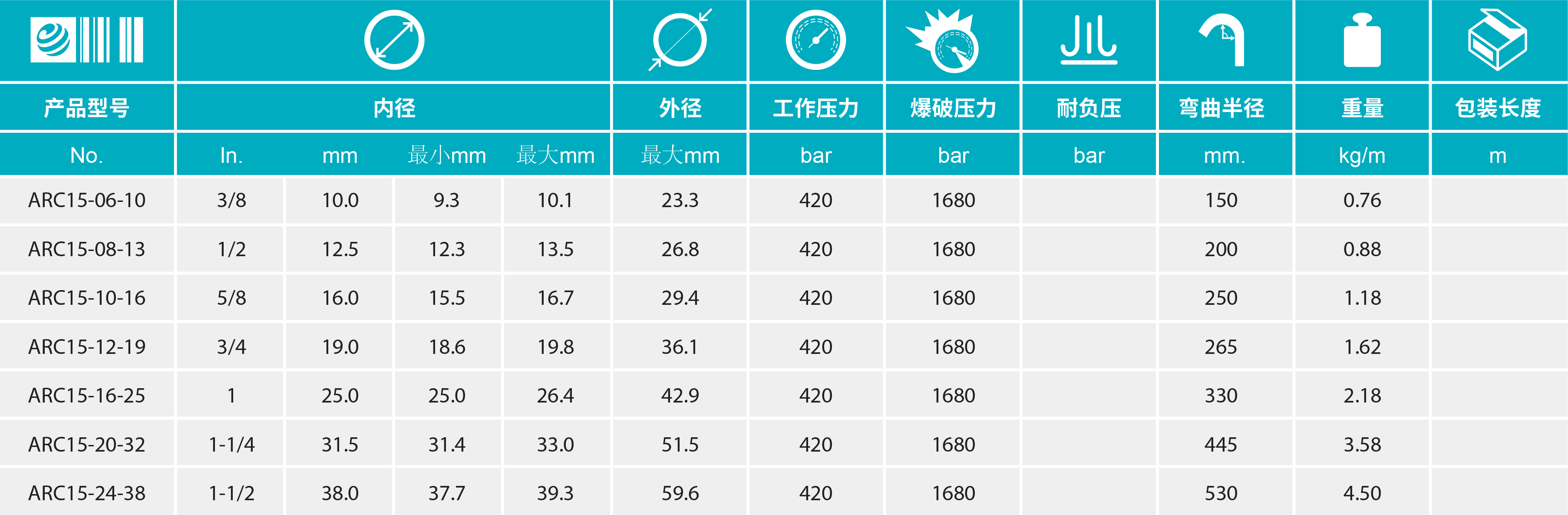 【增强层】四层交互缠绕高强度钢丝(尺寸3/4尺寸和1英寸)和六层交互缠绕高强度钢丝(尺寸1-1/4英寸,1-1/2英寸和2英寸)