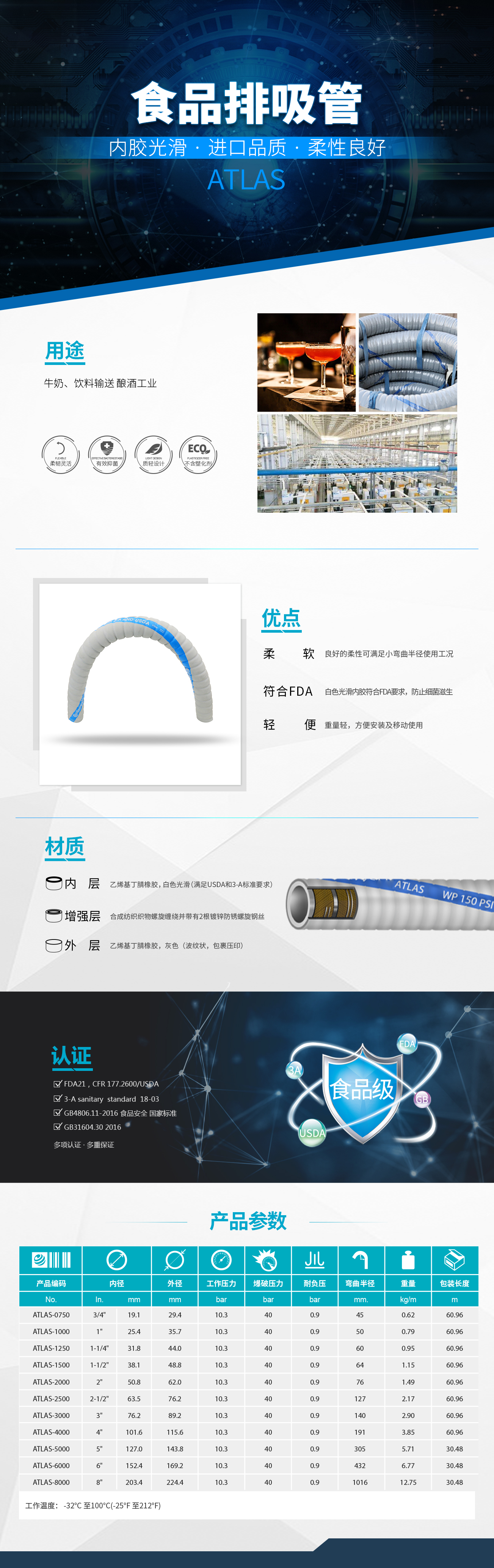 - 轻质且非常柔韧的食品管,可用于食品物质如牛奶,饮料等的重力流、压力流和抽吸流的输送。推荐用于酿酒工业专用输送软管。