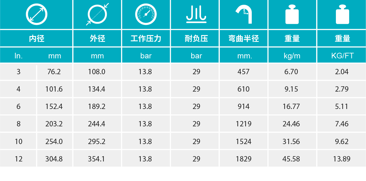 【内层】可输送芳香烃含量达50%的油品的,Nitrile合成橡胶作为内层;另有一种可输送含芳香类物质达100%的油品的,Flosyn(氟橡胶)管内层