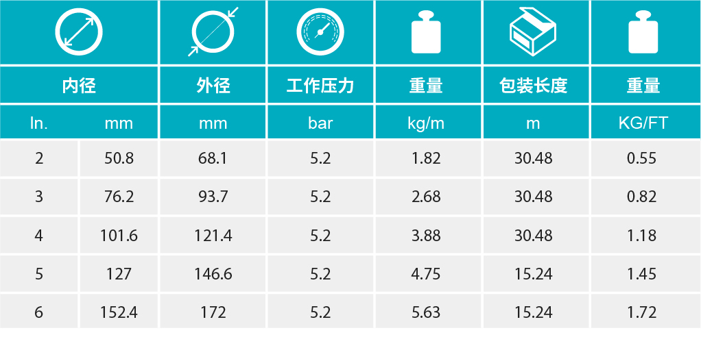 本品为采用纤维加固的胶管,可用于输送沙子、石灰石、碎石、塑料球粒和干性食品等具有磨损性的和非油型的物料。仅用于不存在静电累积的作业场合。