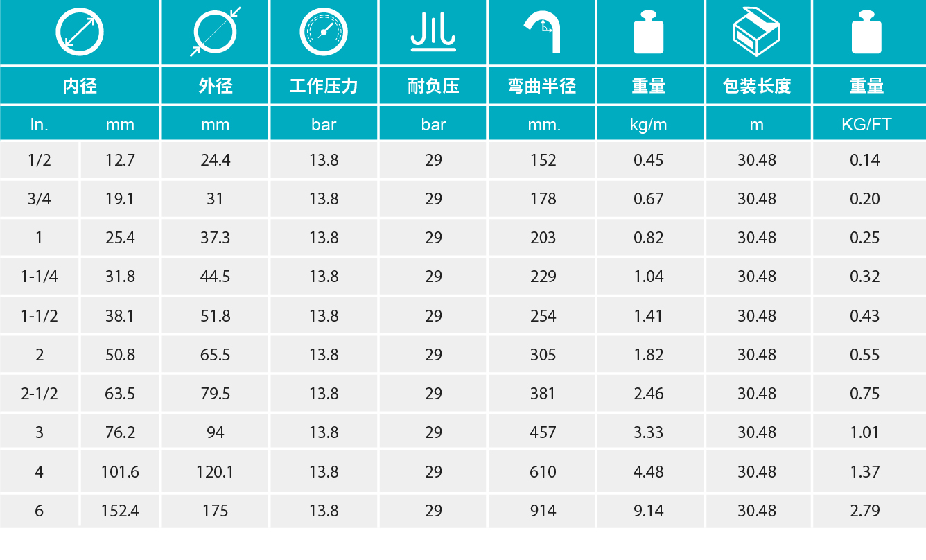 • 【增强层】多层螺旋缠绕的合成纤维,带有两条金属螺旋丝