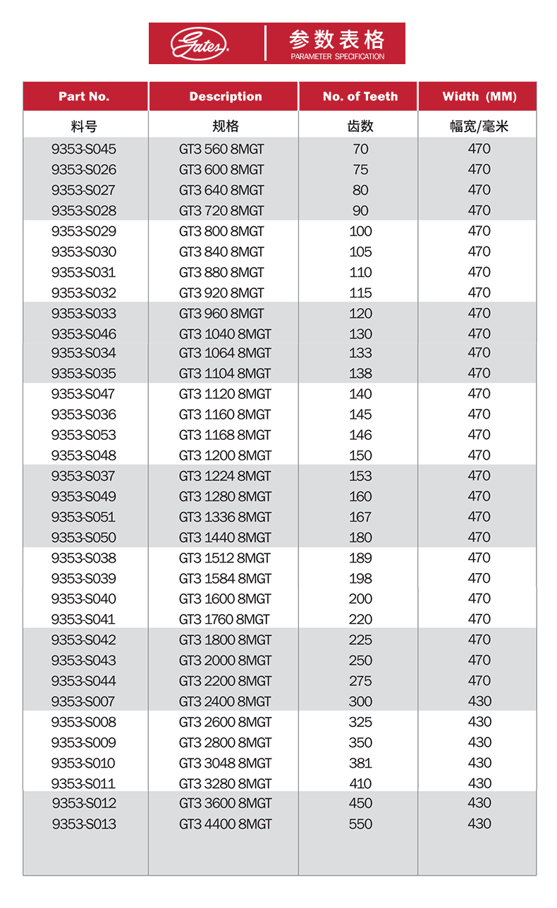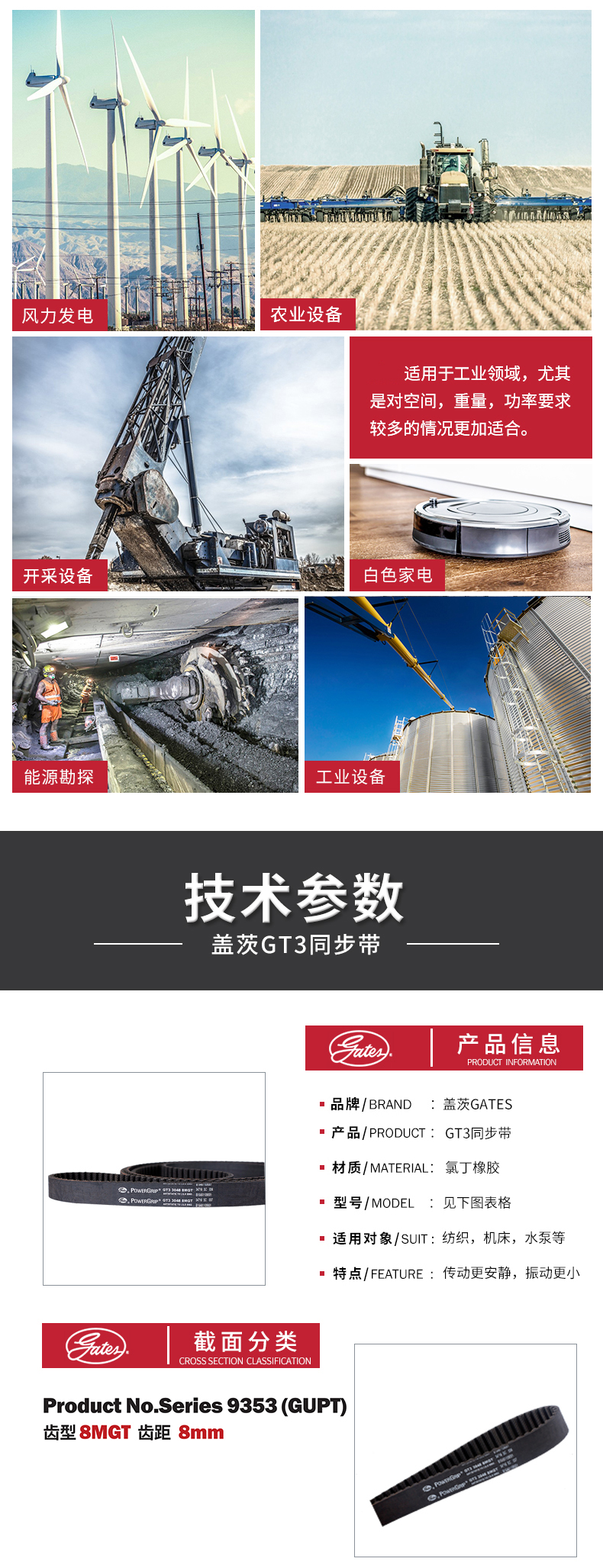 盖茨的齿型结构可和对应带轮匹配,带轮和皮带齿的高度啮合能够提高其传动精度,降低运行噪音。