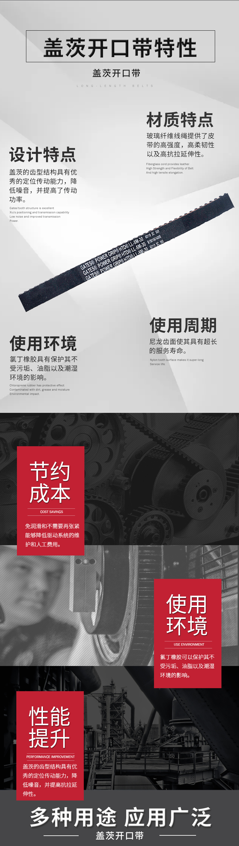 盖茨的齿型结构具有较好的定位传动能力,能够提高其传动功率,降低运行噪音。