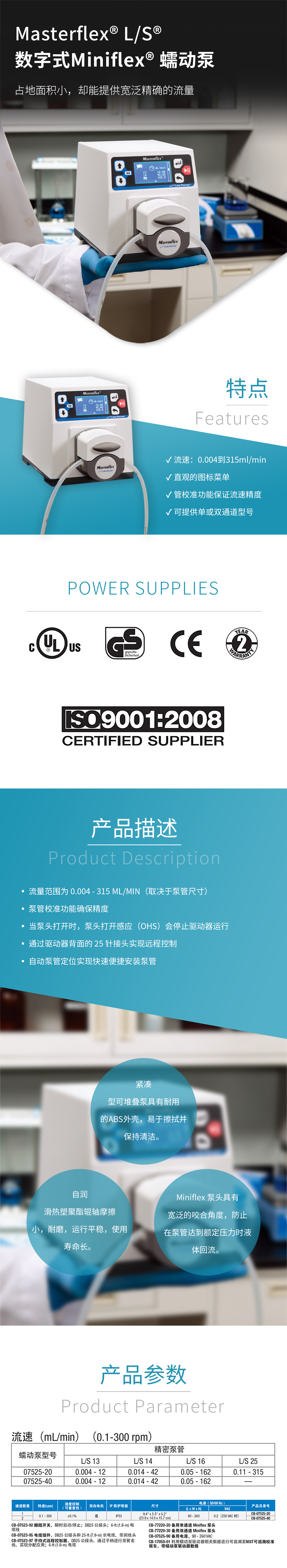 流量范围为 0.004 - 315 mL/min(取决于泵管尺寸)