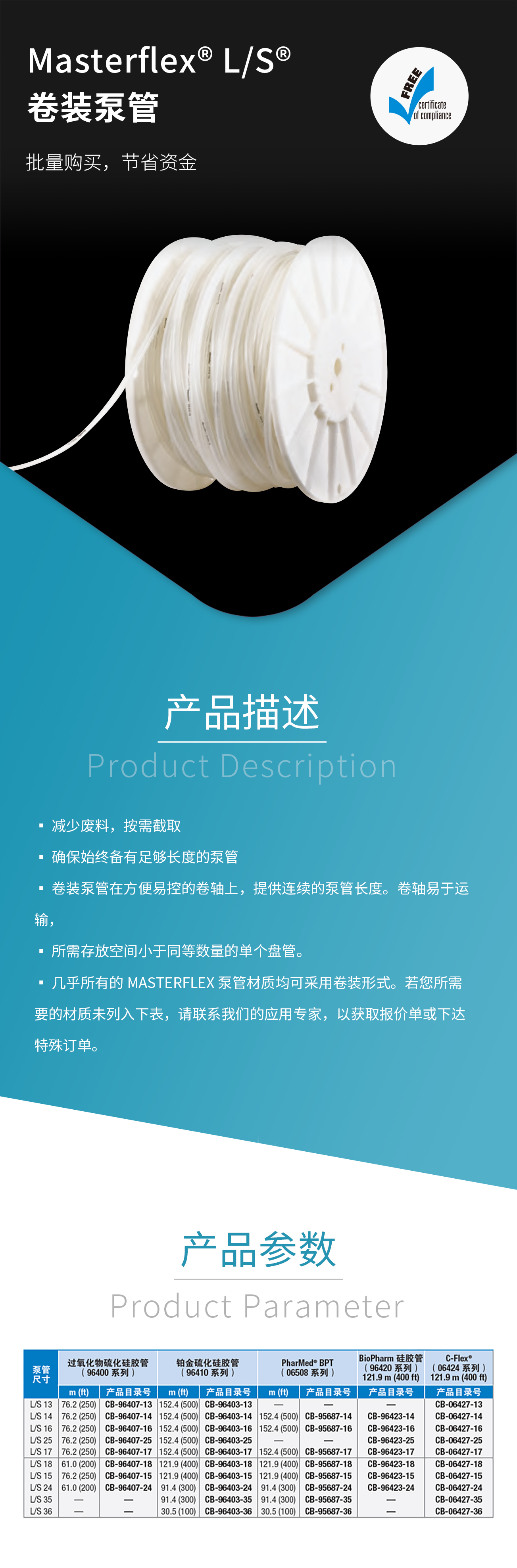 • 卷装泵管在方便易控的卷轴上,提供连续的泵管长度。卷轴易于运输,所需存放空间小于同等数量的单个盘管。
