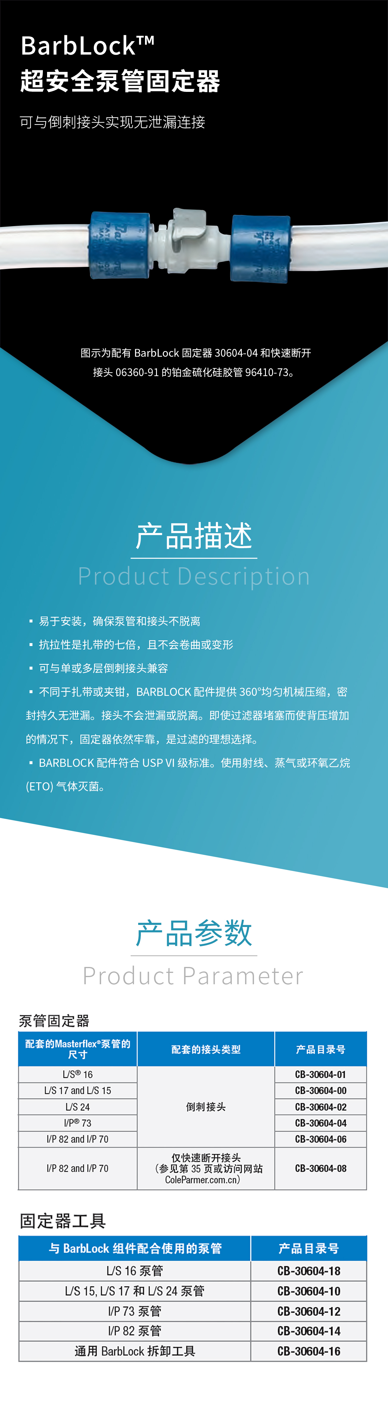 不同于扎带或夹钳,BarbLock 配件提供 360°均匀机械压缩,密封持久无泄漏。接头不会泄漏或脱离。即使过滤器堵塞而使背压增加的情况下,固定器依然牢靠,是过滤的理想选择。