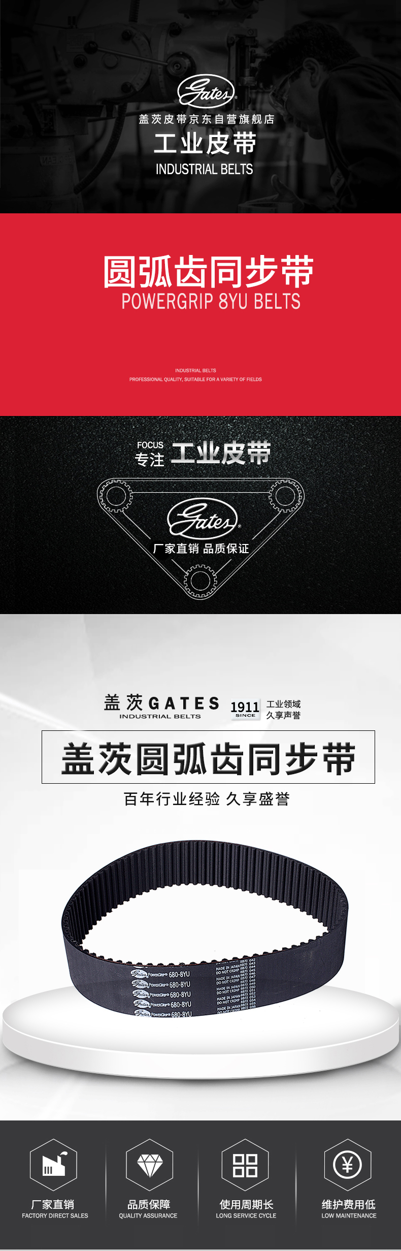盖茨的齿型结构可和对应带轮匹配,带轮和皮带齿的高度啮合能够提高其传动精度,降低运行噪音。