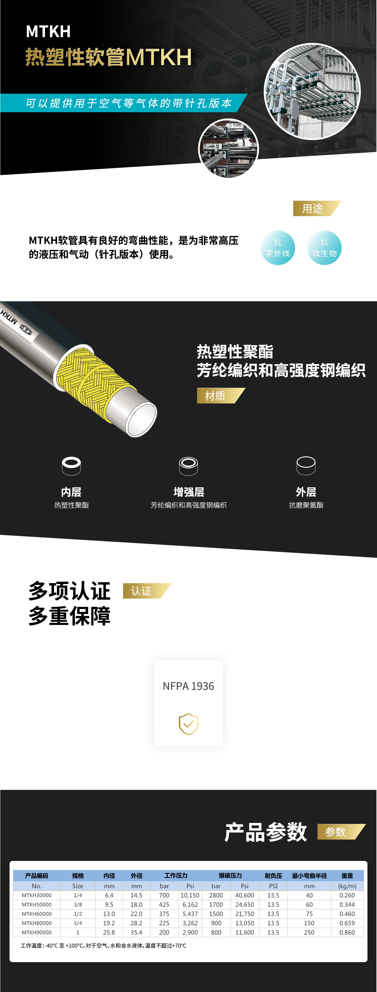 MTKH软管具有良好的弯曲性能,是为非常高压的液压和气动(针孔版本)使用。