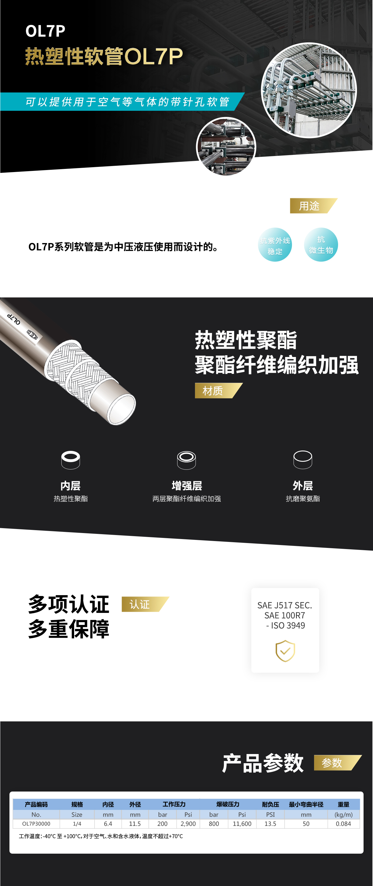 【外层】抗紫外线和抗微生物的抗磨聚氨酯,可以提供用于空气等气体的带针孔软管