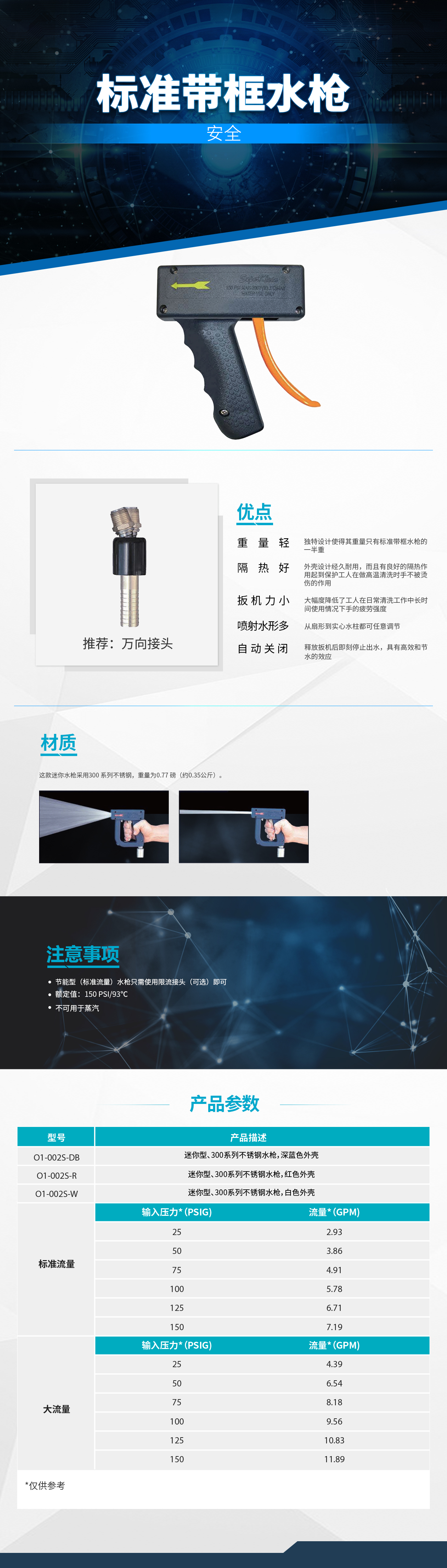 Superklean的行Duraflow迷你水枪重量轻、性能全。轻型设计使得其重量只有DH150系列水枪的一半重。其外壳设计经久耐用,而且有良好的隔热作用起到保护工人在做高温清洗时手不被烫伤的作用。产品重量轻,扳机力小,大幅度降低了工人在日常清洗工作中长时间使用情况下手的疲劳强度。