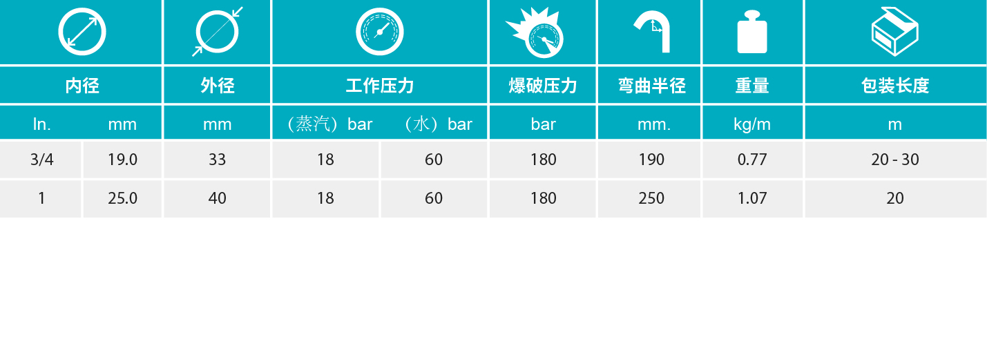 - 外层耐油,用于输送工作压力为18bar/温度为210℃的饱和或过热蒸汽。广泛应用于石化、EPS、建筑、船厂等工业领域。