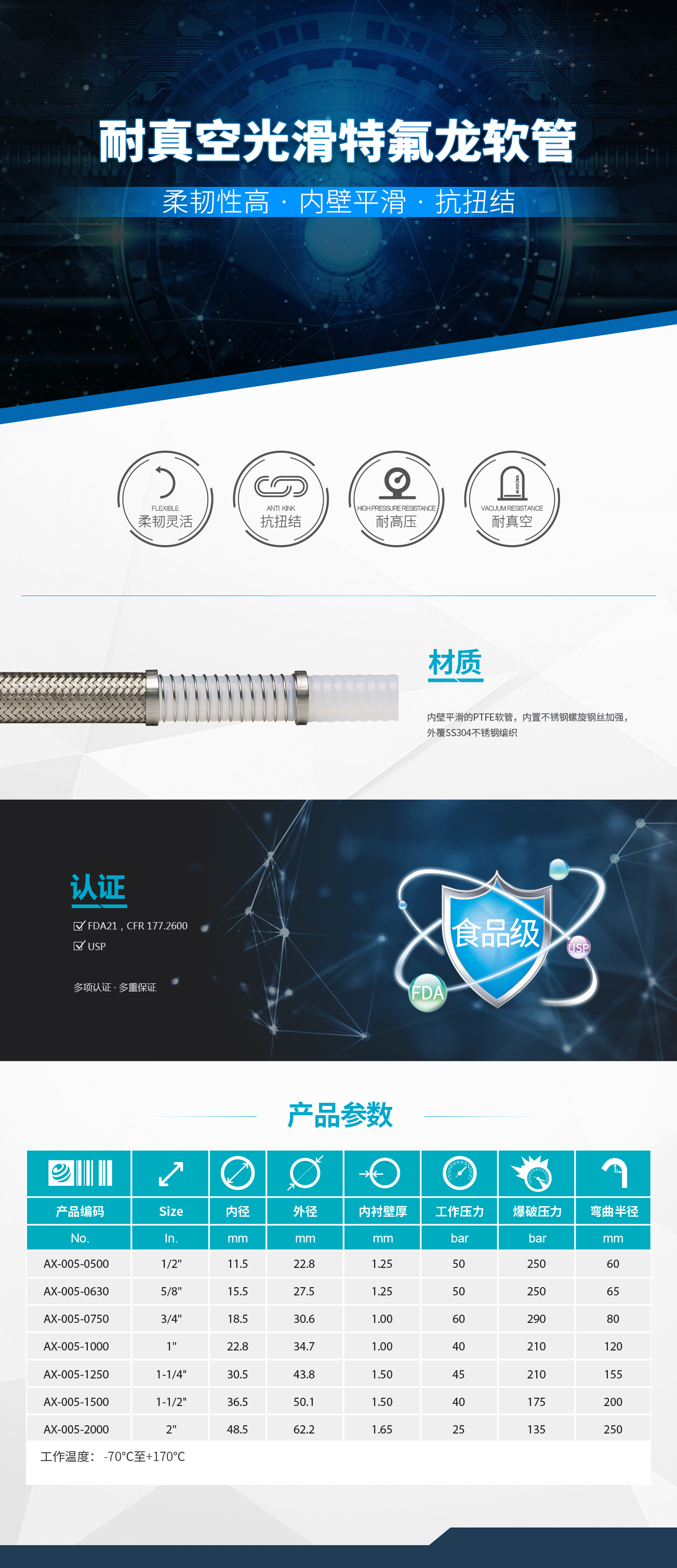 柔韧性高,抗扭结,即使在高温时都有很好的耐高压和耐真空性能, 特别适用于粘性介质的输送,动态工况及对清洁要求很高的场合