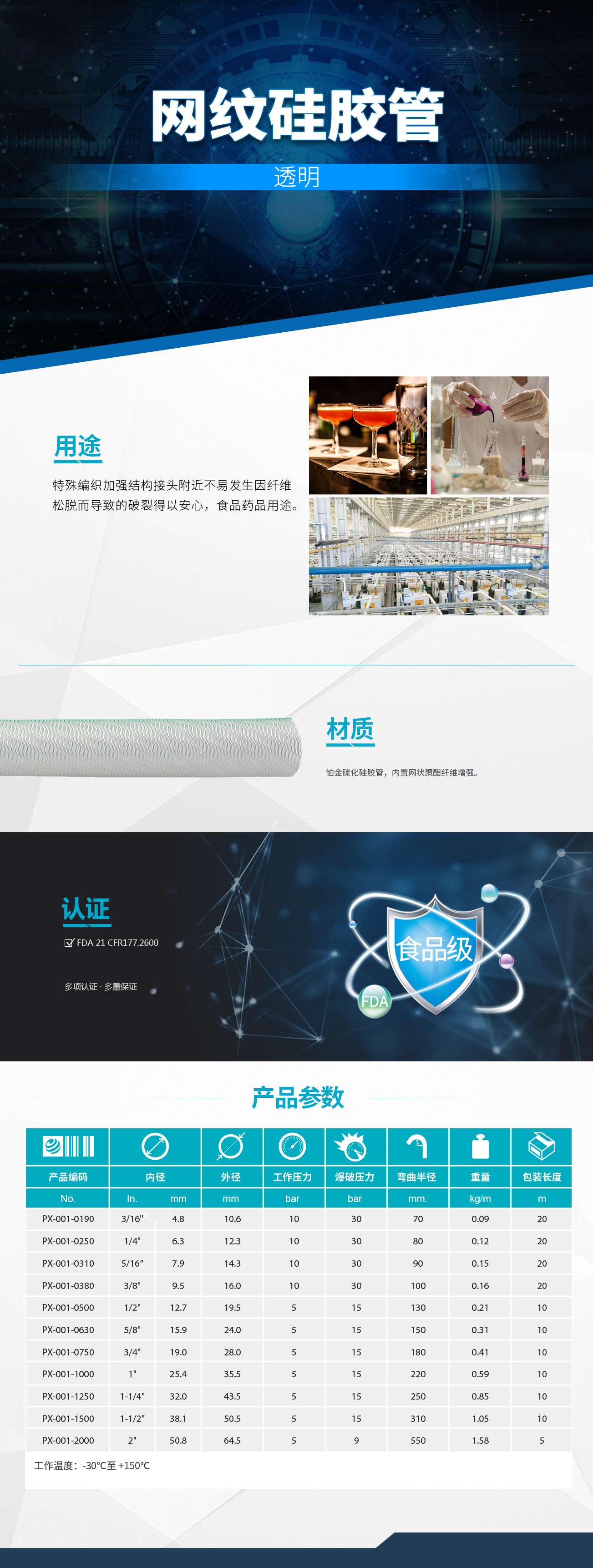 • 特殊加强构造、防破裂:独特加强构造,杜绝接头边缘的脱丝破裂,提高可靠性 无味、无臭:没有气味,也没有会影响流体的溶出物,可安心用于食品饮料等