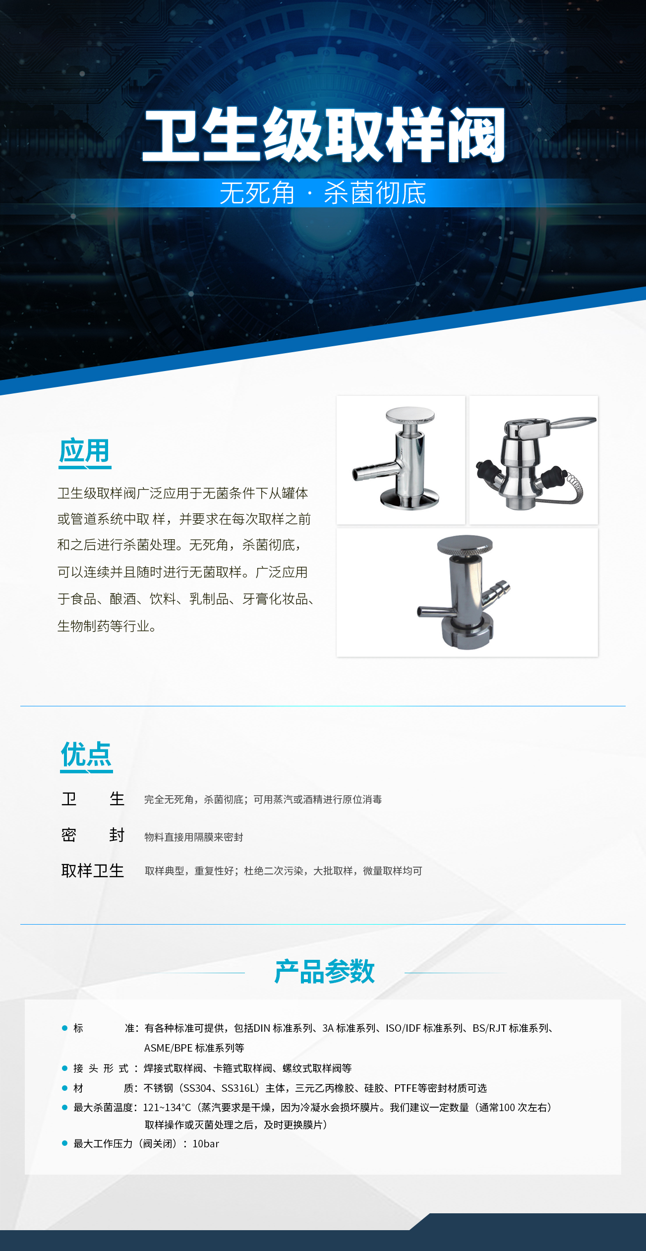 - 卫生级取样阀广泛应用于无菌条件下从罐体或管道系统中取样,并要求在每次取样之前和之后进行杀菌处理。无死角,杀菌彻底,可以连续并且随时进行无菌取样。广泛应用于食品、酿酒、饮料、乳制品、牙膏化妆品、生物制药等行业。