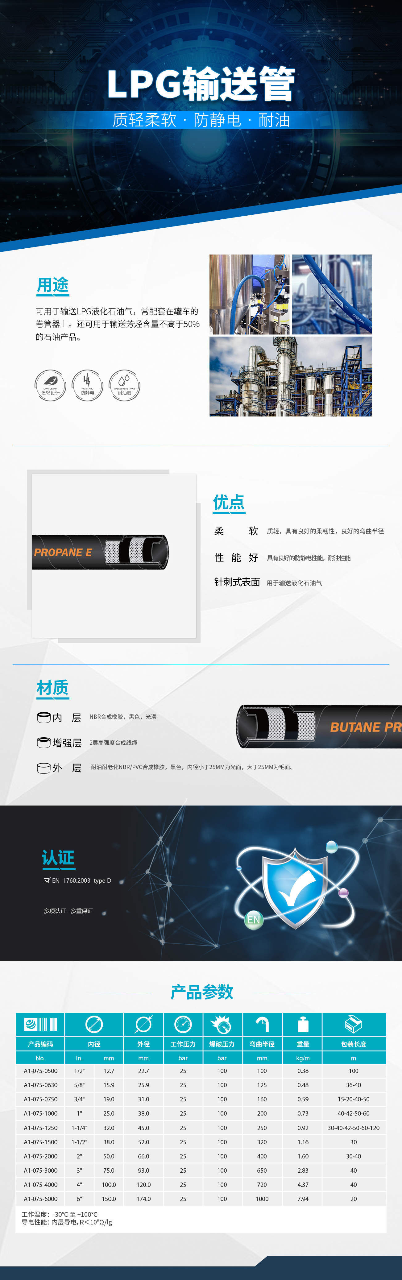 可用于输送LPG液化石油气,常配套在罐车的卷管器上。还可用于输送芳烃含量不高于50%的石油产品。