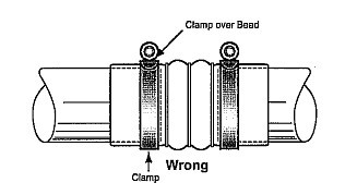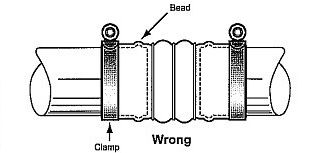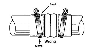 不正确的安装方式 虽然喉箍也能被扭转到一个合适的扭矩值,但膨胀节 在压力的作用下运作,会使喉箍从软管边缘脱落,导致软管泄露。 |