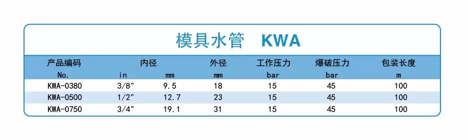 在此小编为大家推荐一款模具水管——KWA,该产品专为模具行业设计,具有长时间耐高温(95-150℃)特性、良好的弯曲半径(适应安装空间)、好的抗老化能力并且其规格可满足多数模具冷却系统的孔径及水量要求。