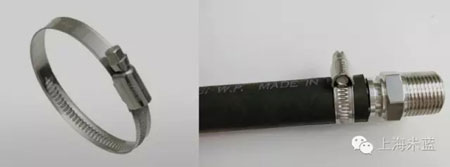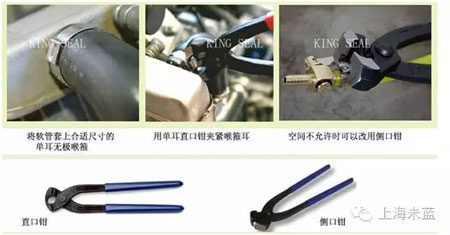 将软管套上合适尺寸的单耳无极喉箍,套入连接装置,并将喉箍放在正确的位置上,然后用单耳直口钳夹紧喉箍耳