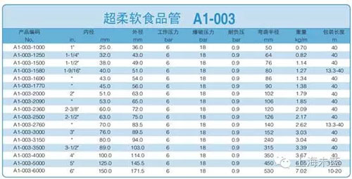 这是一款超柔软的食品软管,针对收奶,罐车等方面应用性价比很好,技术参数,如下。