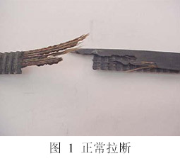 在皮带运转 2 到 3 年后,当其芯线达到疲劳寿命时,皮带失效是属于正常情况。在经过长期运转后,皮带由于芯线达到疲劳寿命而失效,这属于理想的皮带失效模式。图 1 是一个参差不齐的45 度角的锯齿状断裂皮带,这是典型的皮带芯线达到正常的疲劳寿命造成的。