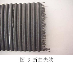 当皮带芯线弯曲到非常小的直径时,这种失效模式就会发生。急剧的弯曲会使皮带芯线纤维在巨大的压力下弯曲和受损,从而使皮带的拉伸强度下降。皮带折曲失效是常见的一种失效模式,通常与皮带操作不当、安装张紧力过低、带轮的直径过小和带轮里有异物等有关。