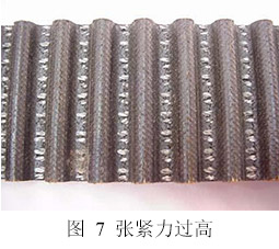 同步带安装张力过高会导致皮带齿部剪切或断裂。很多张力过高的皮带在皮带齿面上都清晰地留下了轮齿磨损的痕迹。图6是皮带被压过的表面区域和齿根开裂的例子。齿根开裂通常会通过芯线扩展到其相邻的开裂处,个别的皮带齿部会慢慢脱落。图7是张紧力过高的皮带在大带轮上被磨过的痕迹。过高的皮带表层压力会导致皮带大面积区域磨损,导致皮带芯线暴露在外。为了防止这样的磨损问题,适当的皮带安装张力值必须要准确的设定。