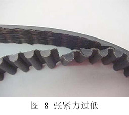 中度到高度负荷的传动系统中安装张力过低也会导致皮带过早的失效。通常张力过低导致的皮带失效模式表现为跳齿。皮带跳齿是指皮带的齿爬出其对应的轮槽,并且其根部不再承受负荷。传动负荷进一步作用于皮带侧面使皮带齿部弯曲,然后跳动。齿部滚动时可导致橡胶从齿根沿着芯线撕裂。随着橡胶撕裂的扩散,皮带齿部开始以条状脱离皮带,如图8所示。由于过多跳齿导致的失效可能看起来好像橡胶与线绳的粘度不够。然而,由于粘度不足所导致的失效,皮带中外露芯线通常保持整洁,与滚齿失效模式不同。