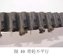 皮带运行在一个带轮两边都有挡边和一个带轮两边都没有挡边时,如果两个带轮不平行,那么皮带会部分向没有挡边的带轮移动,无挡边带轮中这部分皮带将会承受全部负载并且可能在运行一段时间后产生一个集中磨损区域。图11就是大部分齿面的集中磨损,其它地方没有磨损。在磨损区域下面可能会有根部裂缝。皮带强度或齿面疲劳都会导致皮带的过早失效。