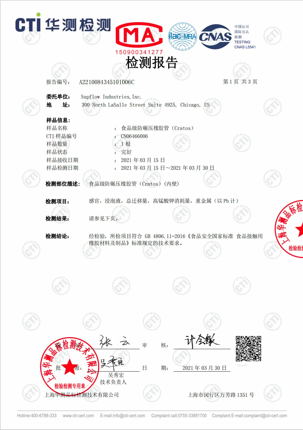 CRATOS符合GB4806.11-2016、GB31604.30-2016、GB9685-2016、FDA 21CFR 177.2600等相关法规和认证。